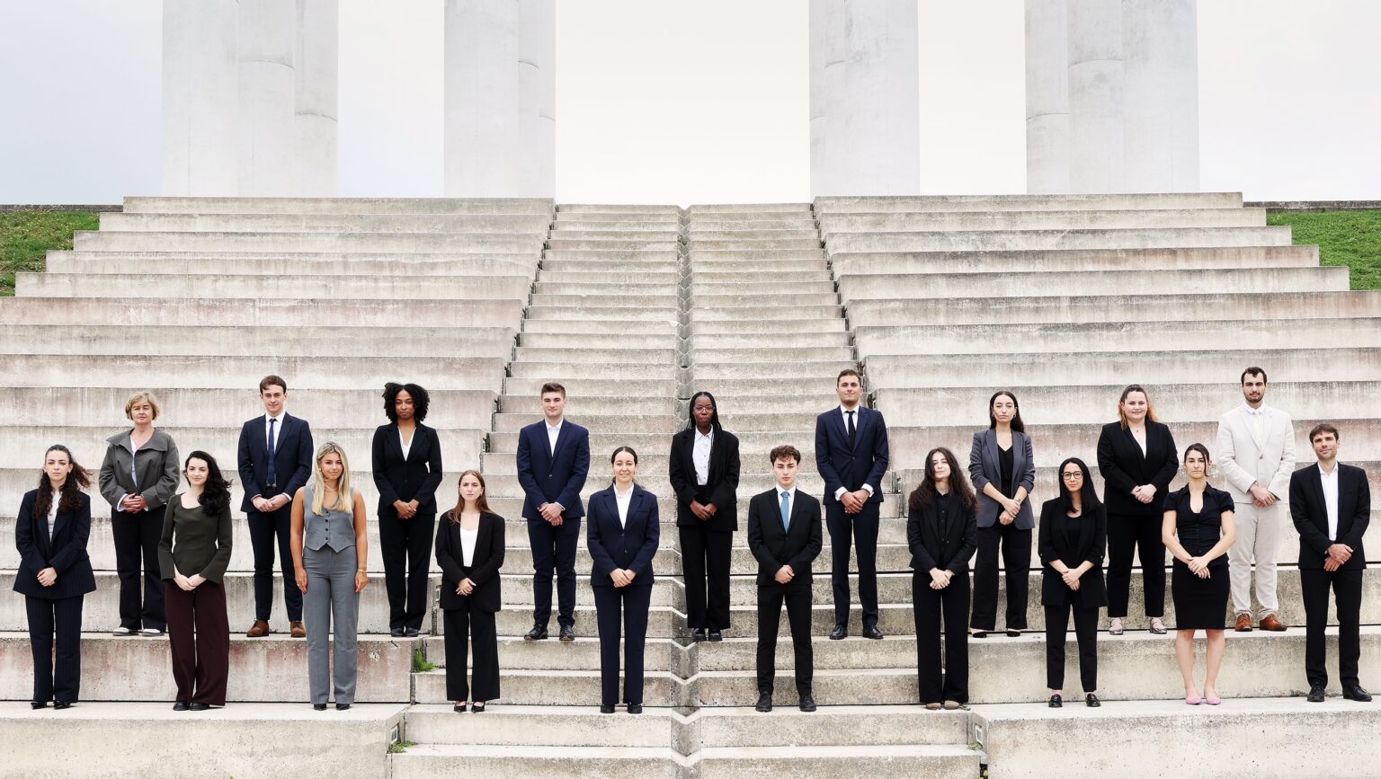 L’ensemble des étudiants de la promotion 2024-2025 du DJCE de CY Cergy Paris Université aux douze colonnes à Cergy, en compagnie des co-directeurs de la formation : Monsieur Vincent MALASSIGNÉ et Madame Anne RABREAU, professeurs en droit privé